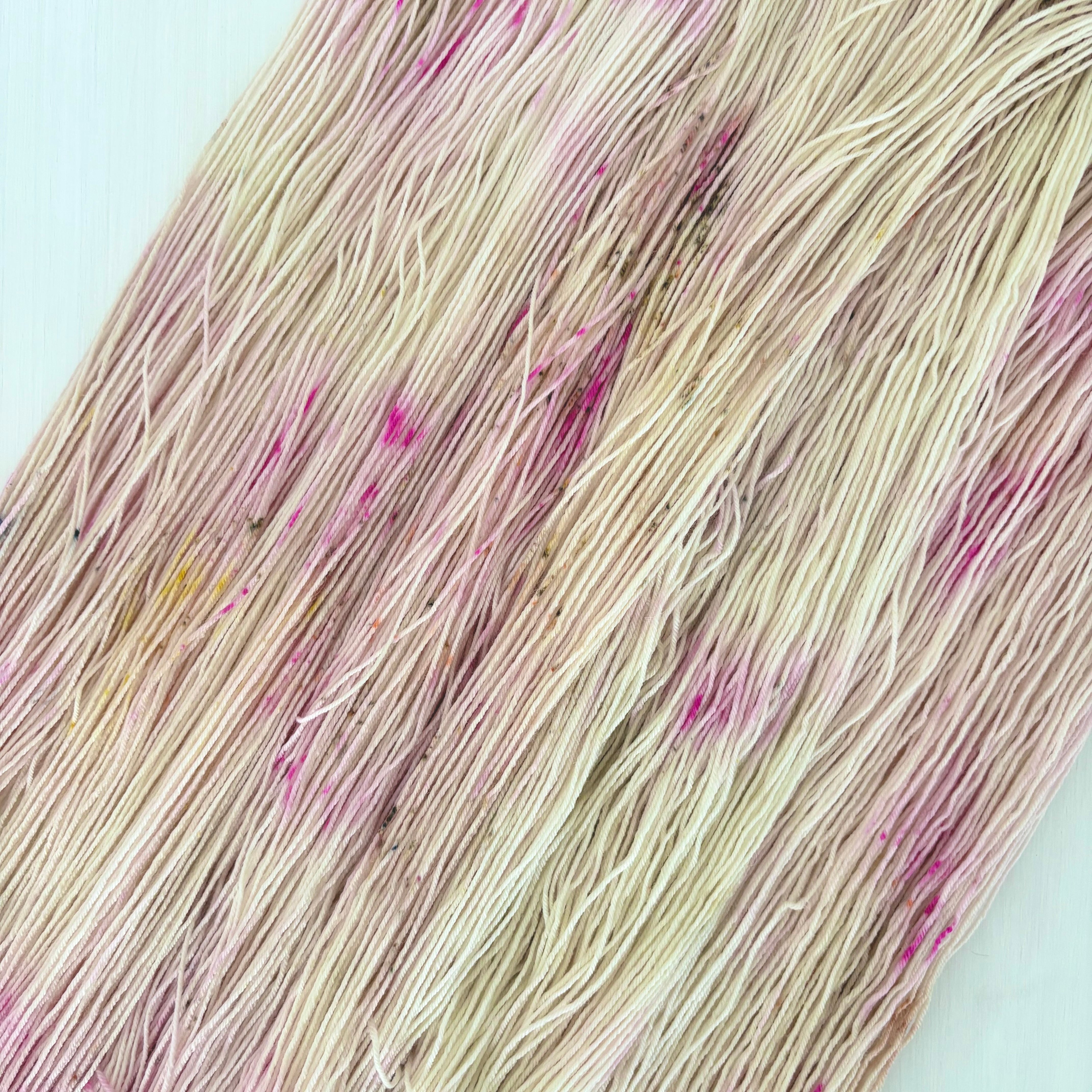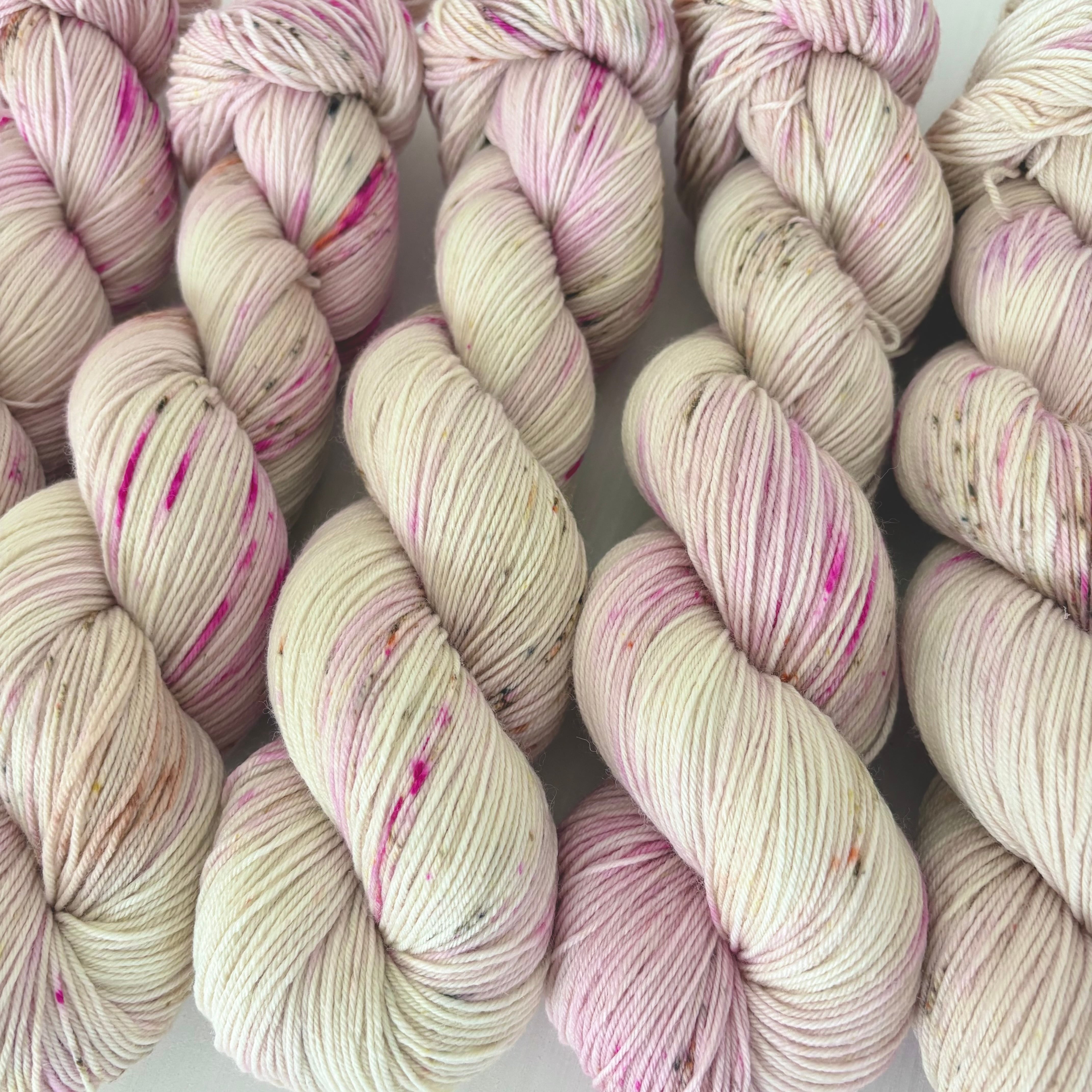 ○毛糸は全て手染めのため、同じ染料同じタイミングで染色したものであっても、かせごとに色の濃淡やスペックルの入り具合が異なります。